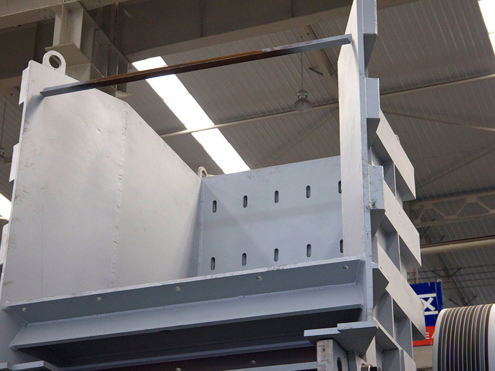 La trituradora de mandíbulas consta principalmente de bastidor, eje excéntrico, polea grande, volante, placa de protección lateral, placa de codo, asiento trasero de la placa de codo, tornillo de holgura, resorte de reajuste, placa de mandíbula fija y placa de mandíbula móvil y otros componentes. El método de trituración pertenece al tipo de extrusión curva. En funcionamiento, el motor acciona la correa y la polea para girar e impulsar la mandíbula móvil hacia arriba y hacia abajo a través del eje excéntrico. Cuando la mandíbula móvil sube, el ángulo entre la placa acodada y la mandíbula móvil aumenta gradualmente, lo que empuja la placa de la mandíbula móvil cerca de la placa de la mandíbula fija, y el material se tritura por extrusión, rozamiento y aplastamiento entre las dos placas de la mandíbula. Cuando la mandíbula móvil se mueve hacia abajo, el ángulo se hace más pequeño, la placa de la mandíbula móvil abandona la placa de la mandíbula fija bajo la acción del tirante y el muelle, y los materiales triturados se descargan por la abertura de descarga situada en la parte inferior de la cavidad de la mandíbula bajo la acción de la gravedad. Con la rotación continua del motor, la mandíbula móvil tritura y descarga periódicamente el material, realizando así la producción en masa.